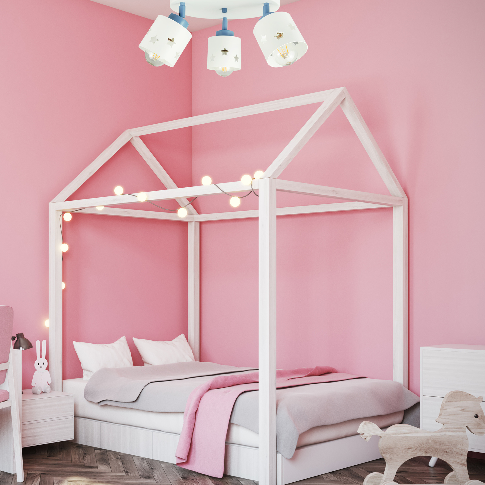 Największym atutem LUNARI są klosze z precyzyjnie wyciętymi gwiazdkami, które – po zapaleniu światła – zamieniają ściany i sufit w magiczną, gwiezdną przestrzeń. Dziecko może zasypiać pod „rozgwieżdżonym niebem” i budzić się w przyjaznym, jasnym pokoju, który sprzyja zarówno zabawie, jak i odpoczynkowi.