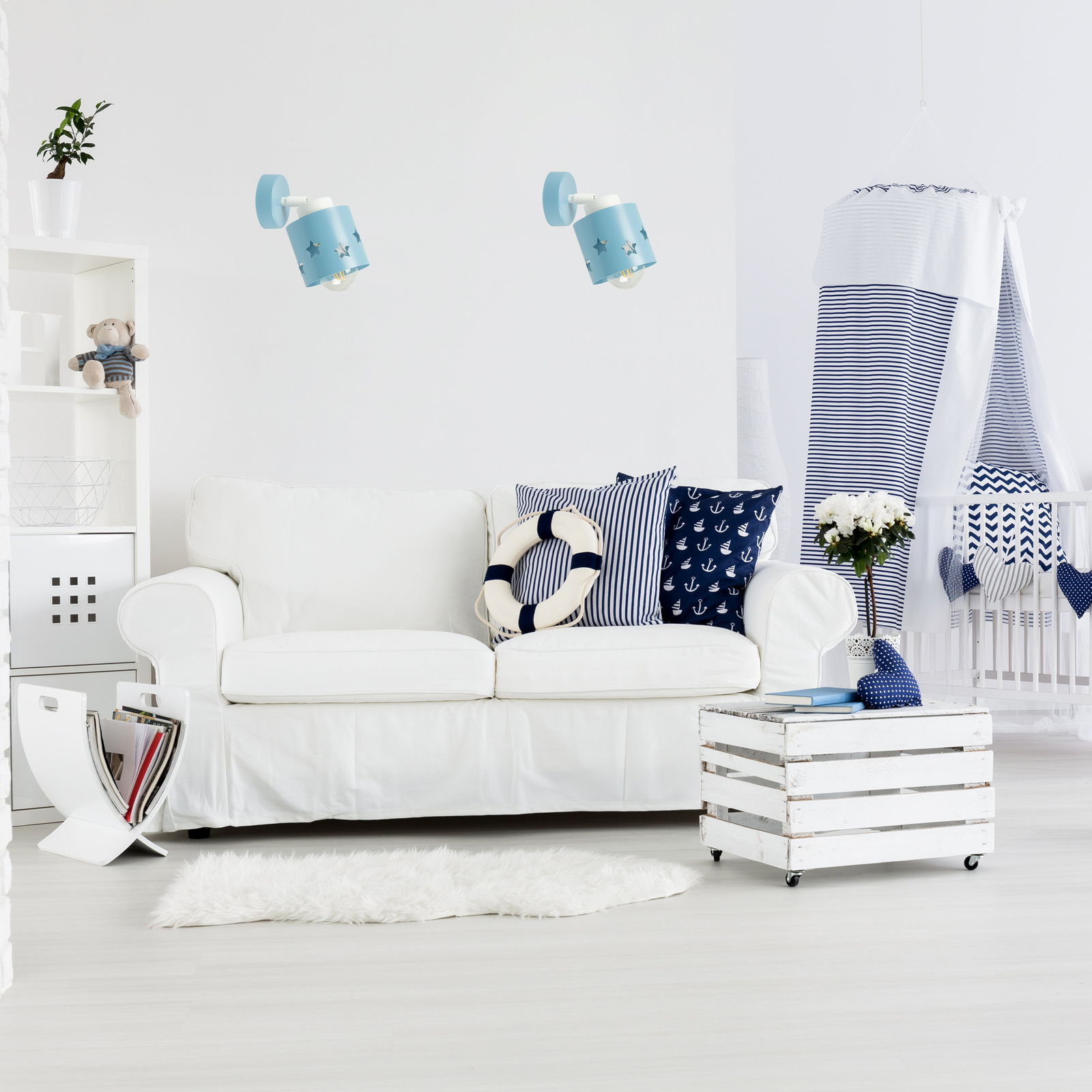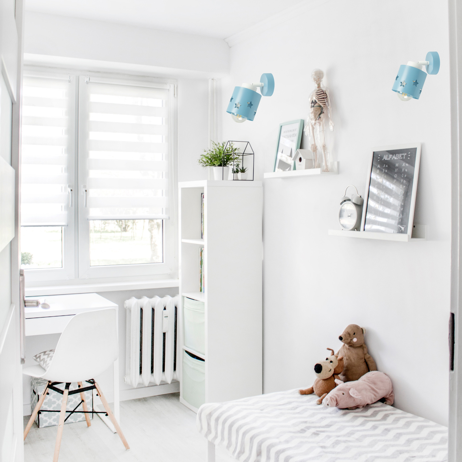 W galerii zdjęć przygotowaliśmy inspirujące aranżacje z kinkietem LUNARI, które pokazują, jak doskonale prezentuje się on w różnych przestrzeniach dziecięcych. Ujęcia z bliska ukazują nie tylko jego staranne wykonanie, ale również piękny, niebieski kolor, dekoracyjne detale oraz efekt świetlny, który tworzą wycięte GWIAZDKI.
