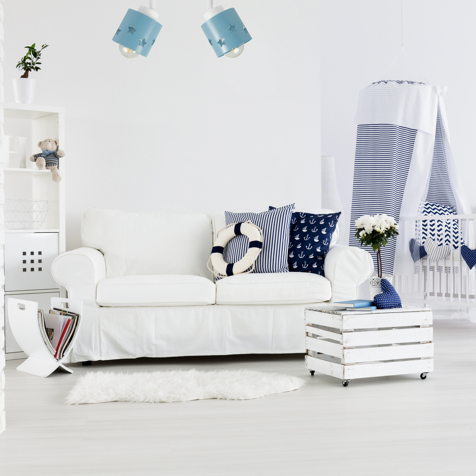 ✨ Znajdziesz tu zarówno aranżacje wnętrz, które pokazują, jak lampa komponuje się z różnymi stylami mebli i dodatków, jak i zbliżenia detali, dzięki którym możesz przyjrzeć się z bliska wycięciom w kształcie gwiazdek, NIEBIESKIEMU kolorowi oraz eleganckim białym wykończeniom.
