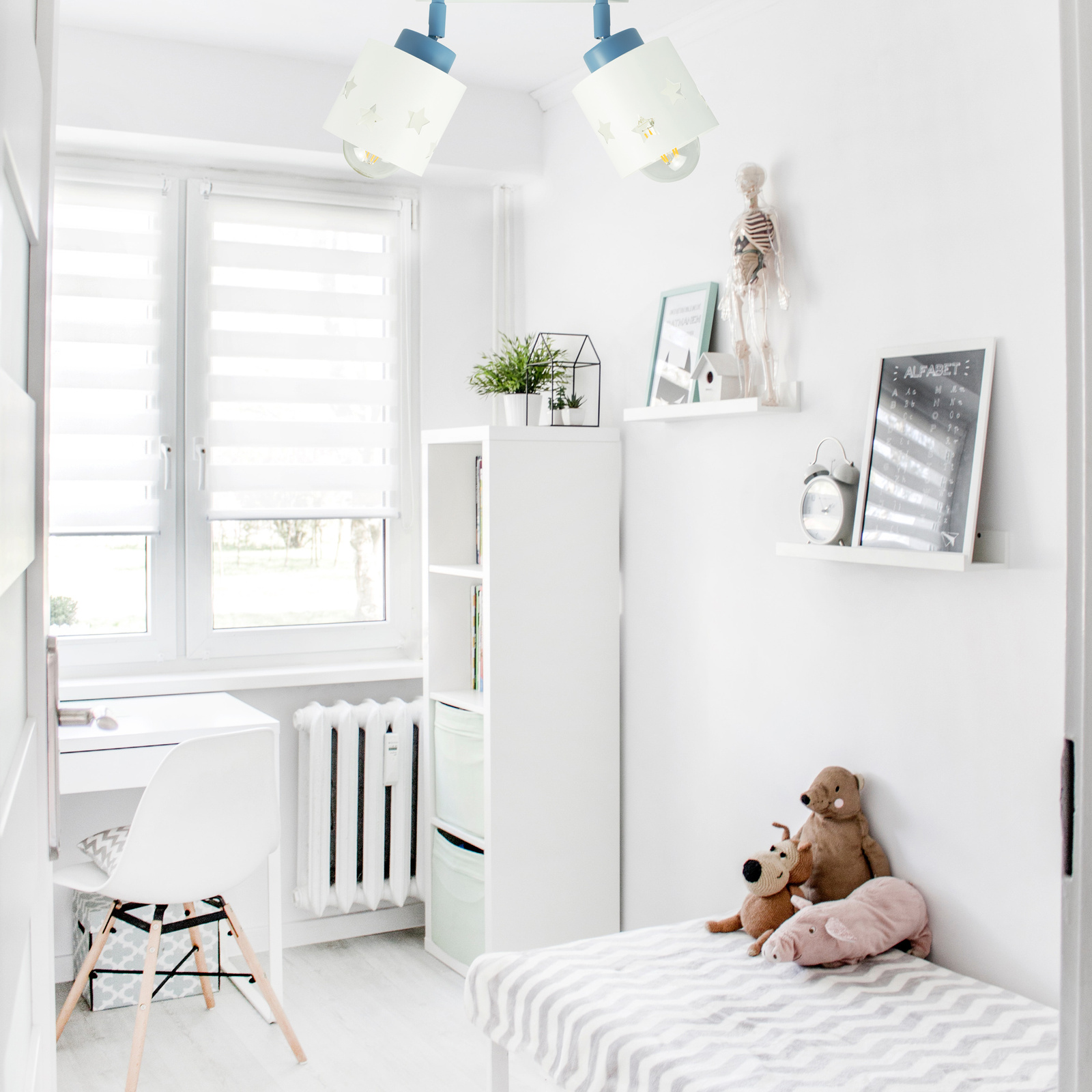 Zobacz, jak delikatna biel i niebieskie akcenty harmonijnie współgrają z pastelowymi meblami, miękkimi tekstyliami i kolorowymi dodatkami. Zdjęcia pomogą Ci wyobrazić sobie, jak ta lampa uzupełni wnętrze Twojego dziecka – od kącika do zabawy po przestrzeń nad łóżkiem czy biurkiem.
