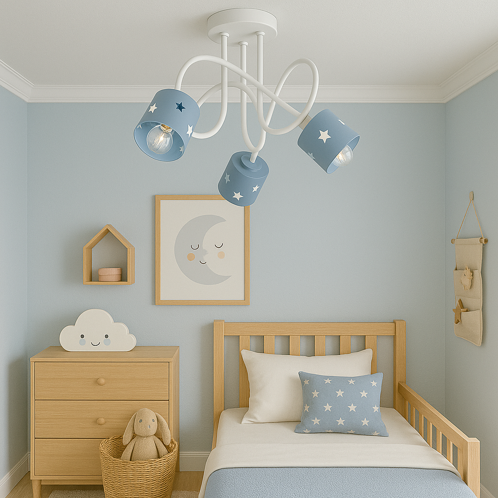 Połączenie czystej bieli z subtelnymi, niebieskimi akcentami sprawia, że LUNARI doskonale komponuje się z delikatnym, skandynawskim stylem oraz wnętrzami urządzonymi z myślą o najmłodszych. Idealna do pokoju dziecięcego, sypialni lub przestrzeni, w której chcesz stworzyć przytulną, bajkową atmosferę.