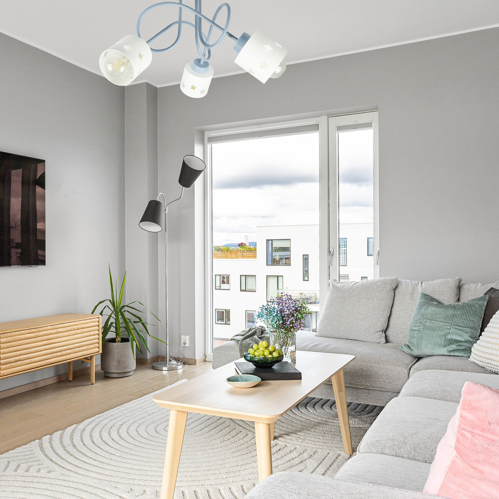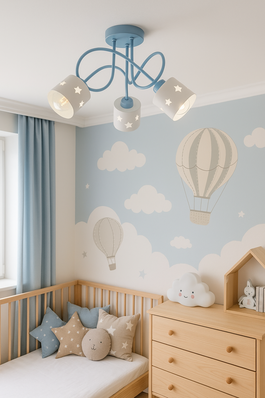 Połączenie pastelowego niebieskiego koloru z białymi kloszami , sprawia, że LUNARI doskonale komponuje się z delikatnym, skandynawskim stylem oraz wnętrzami urządzonymi z myślą o najmłodszych. Idealna do pokoju dziecięcego, sypialni lub przestrzeni, w której chcesz stworzyć przytulną, bajkową atmosferę.