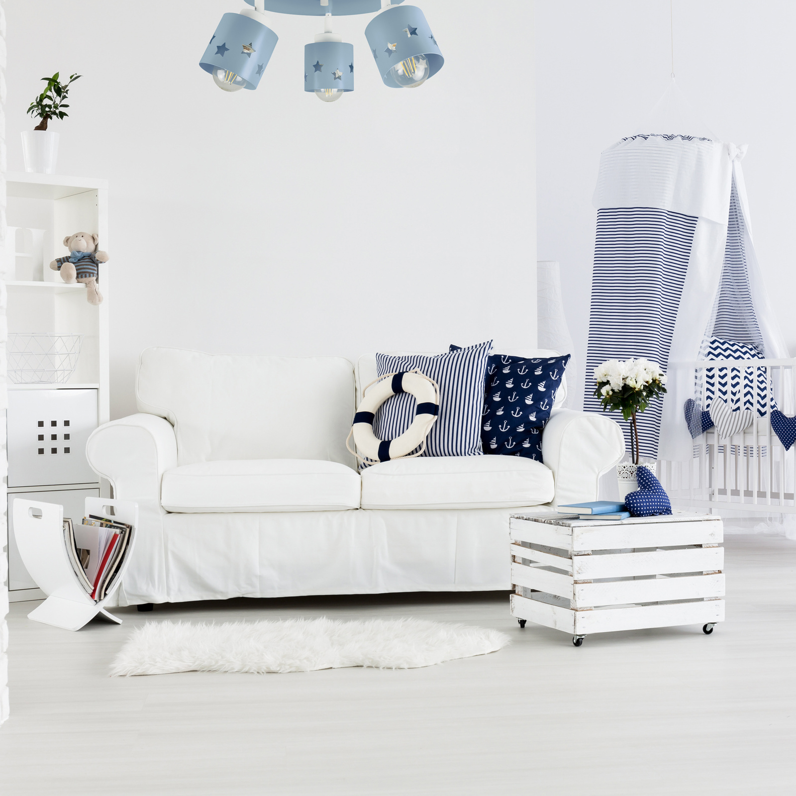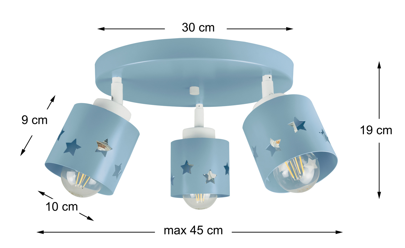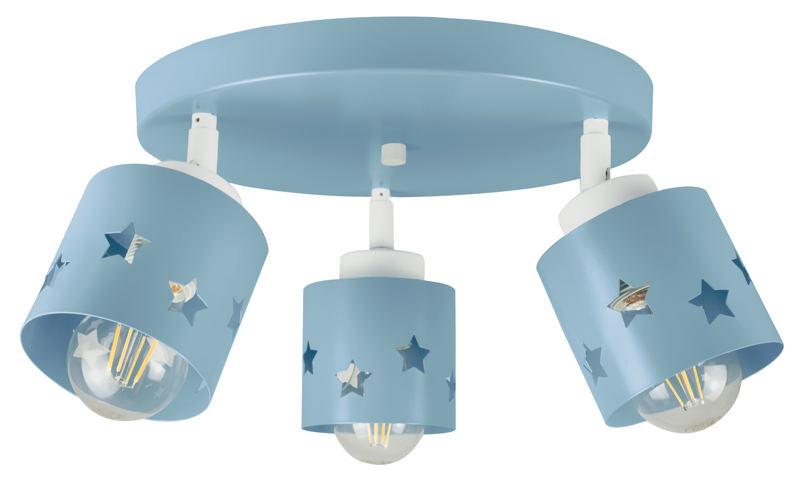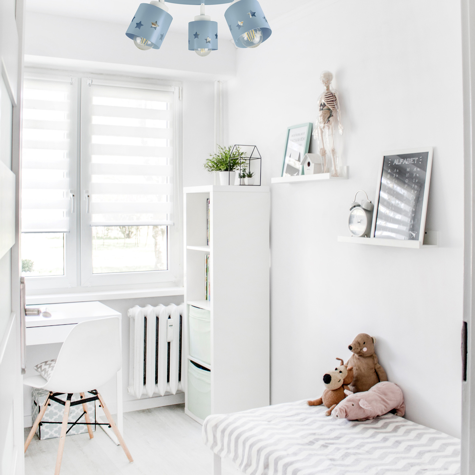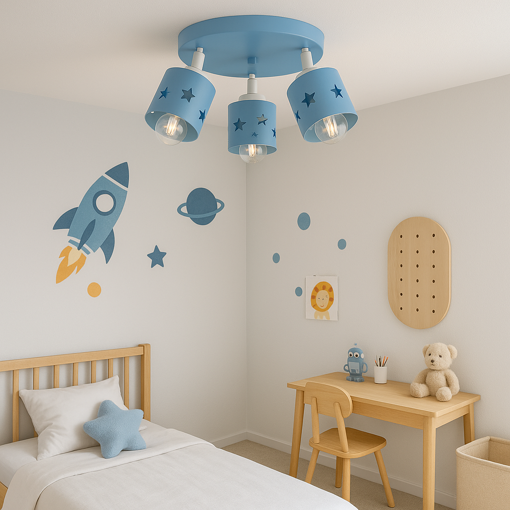 Lampa sufitowa LUNARI to nie tylko źródło światła – to mała podróż do świata wyobraźni! Jej pastelowy niebieski kolor dodaje wnętrzu subtelności i lekkości, a klosze z wyciętymi gwiazdkami tworzą magiczny efekt świetlny, który przypomina rozgwieżdżone niebo.